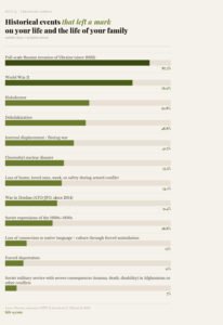 Historical events: 87.3% of participants noted the impact of the full-scale invasion on themselves and their families. Close behind were World War II (76.9%), the Holodomor (50.8%), and the dispossession of the kulaks and subsequent repressions. 71% felt that the events of 2022 served as a trigger for their family history. The greatest losses were land and property (64.5%), native language (59.5%), and spiritual traditions (54.8%).
