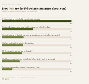 Family dynamics: shame as a tool of control, guilt, and raised voices—the most common patterns in families. Yet 118 out of 299 study participants are proud of their family and people. Resilience coexists with vulnerability—and this is a key clinical finding.
