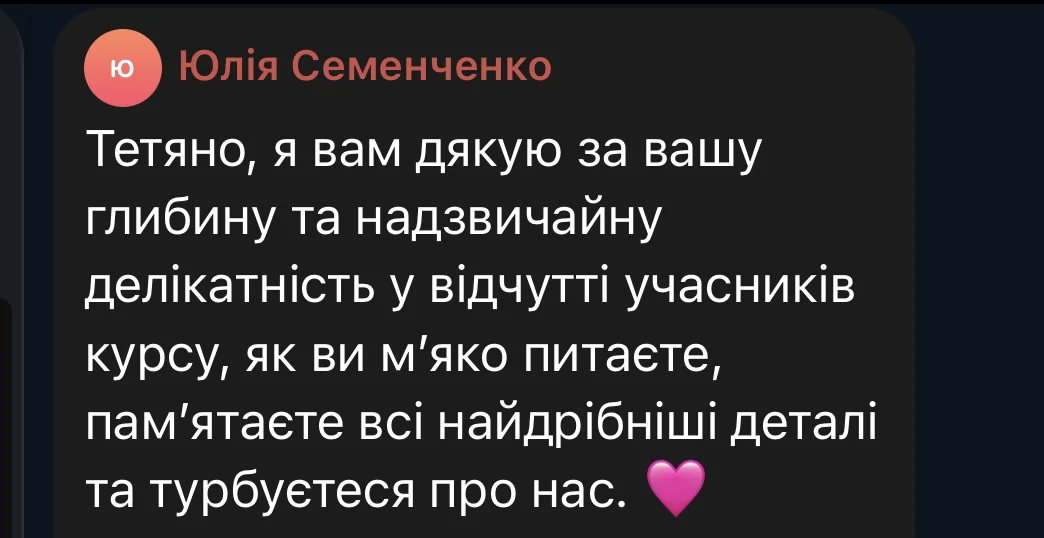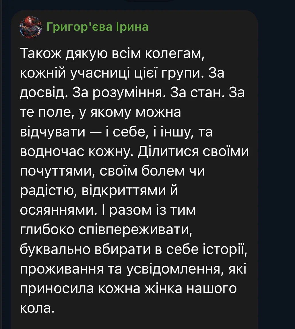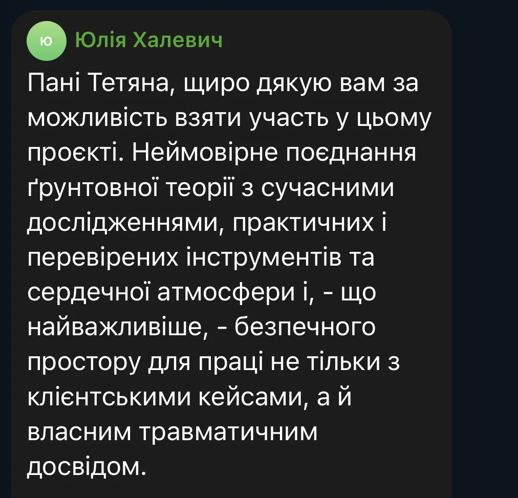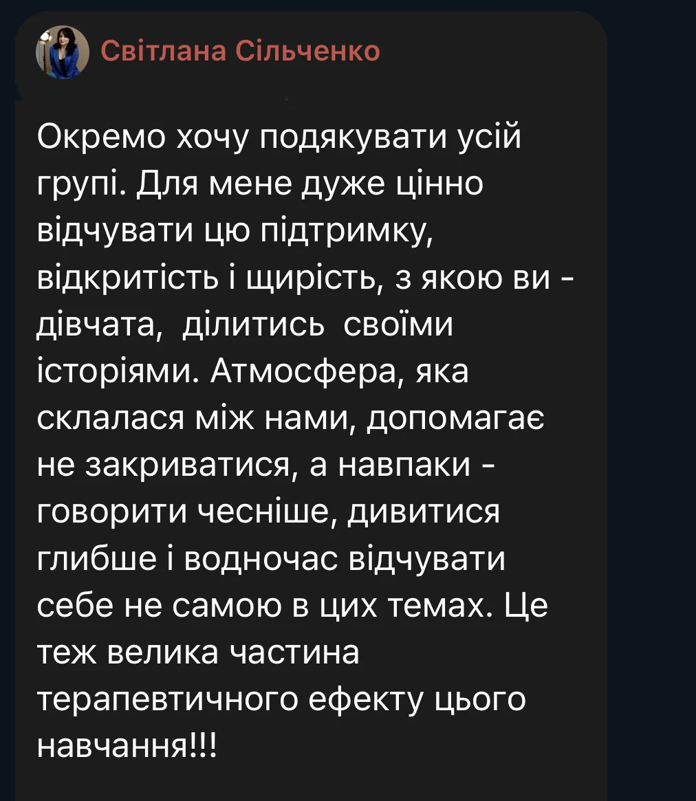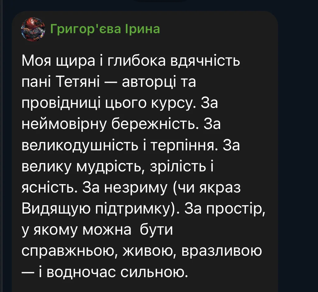 Here are some reviews from participants in the first session of the course (October 3 – December 19, 2025). The course took place amid the realities of full-scale war: rocket attacks and bombings of Ukrainian cities, total blackouts, and cuts to heat, water, and communications. Despite this, we were able to complete the entire course from the first to the last meeting, without any cancellations or postponements.