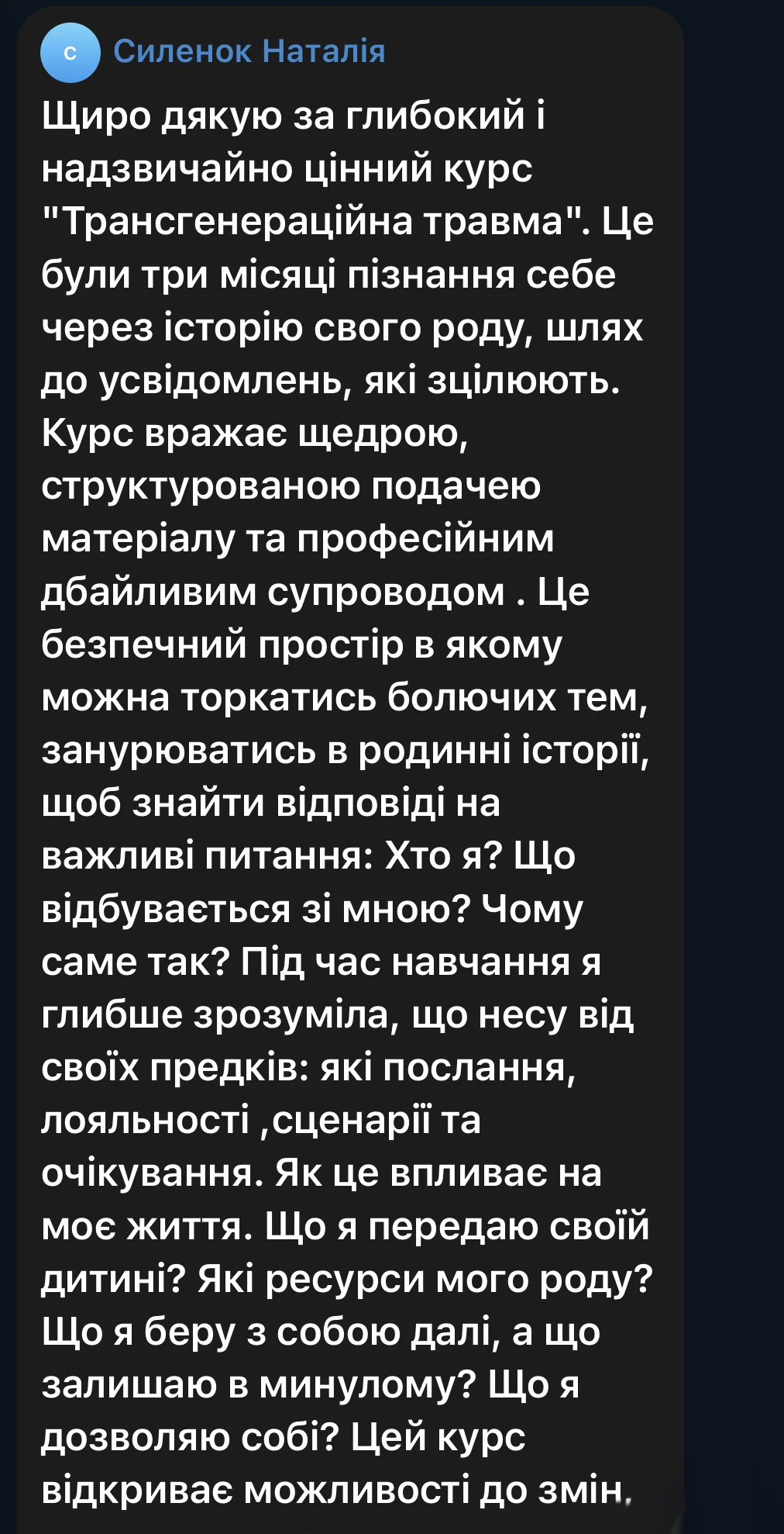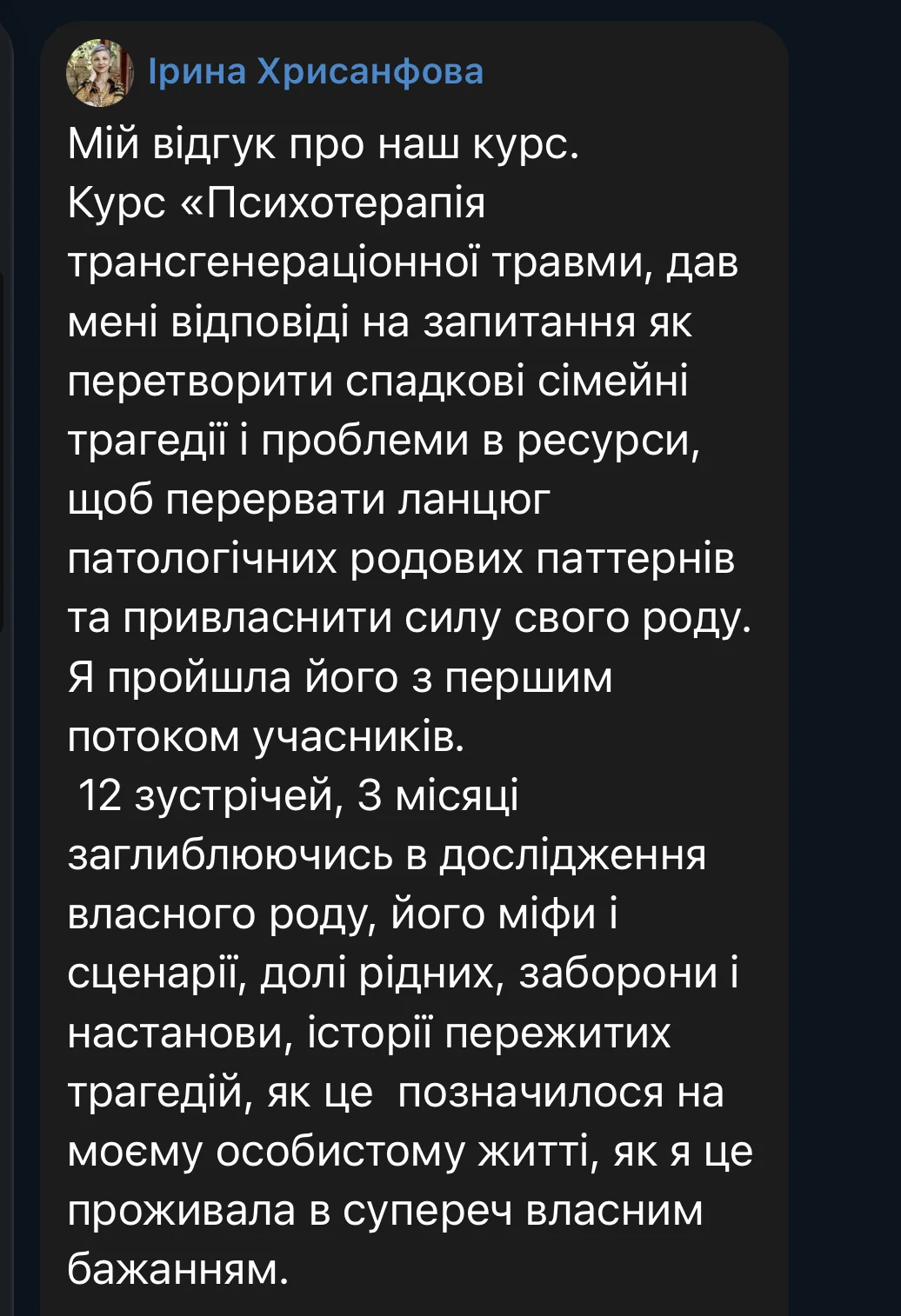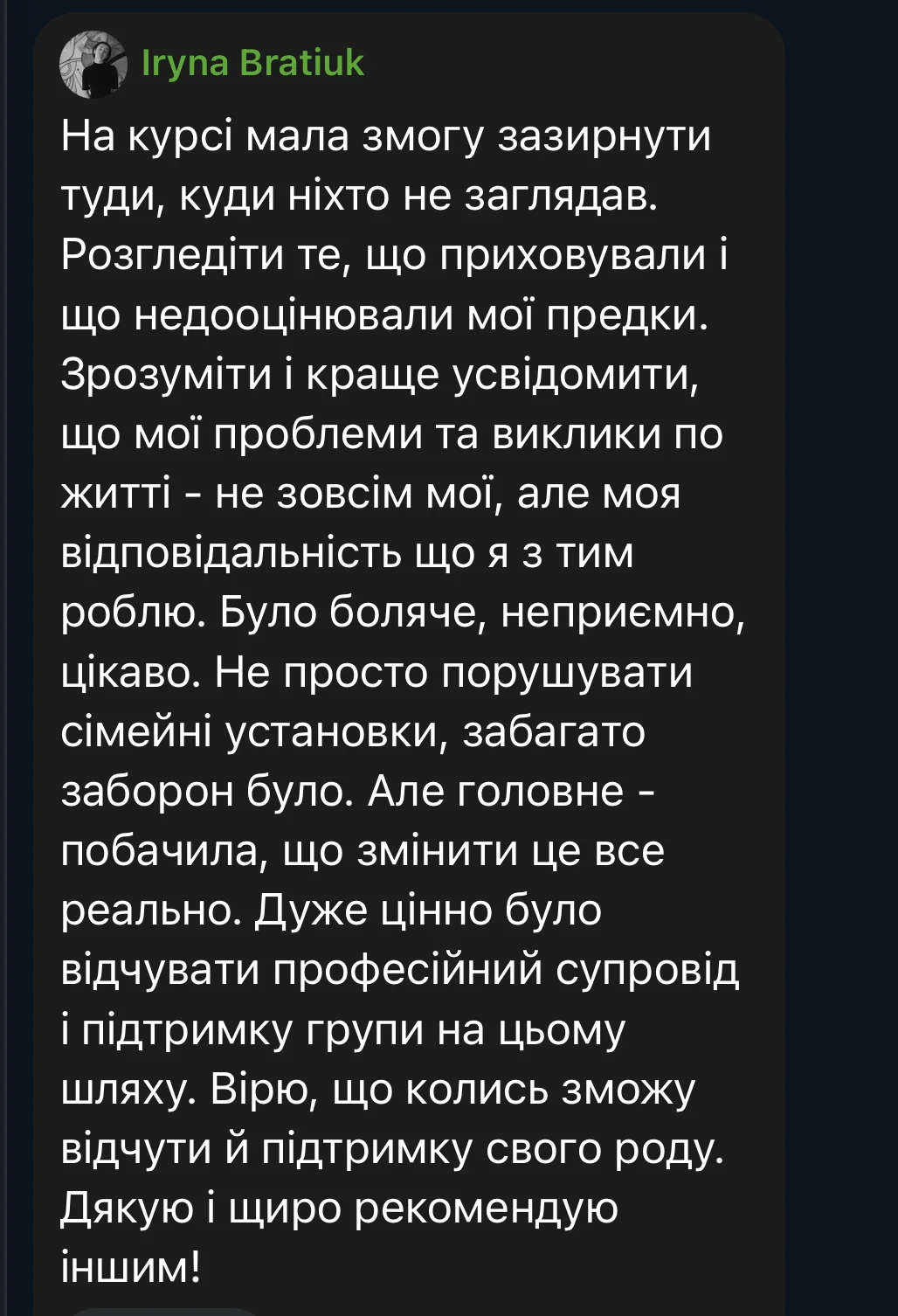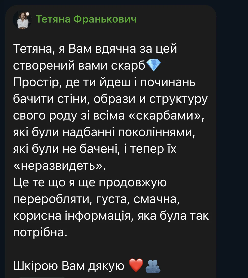 Here are some reviews from participants in the first session of the course (October 3 – December 19, 2025). The course took place amid the realities of full-scale war: rocket attacks and bombings of Ukrainian cities, total blackouts, and cuts to heat, water, and communications. Despite this, we were able to complete the entire course from the first to the last meeting, without any cancellations or postponements.