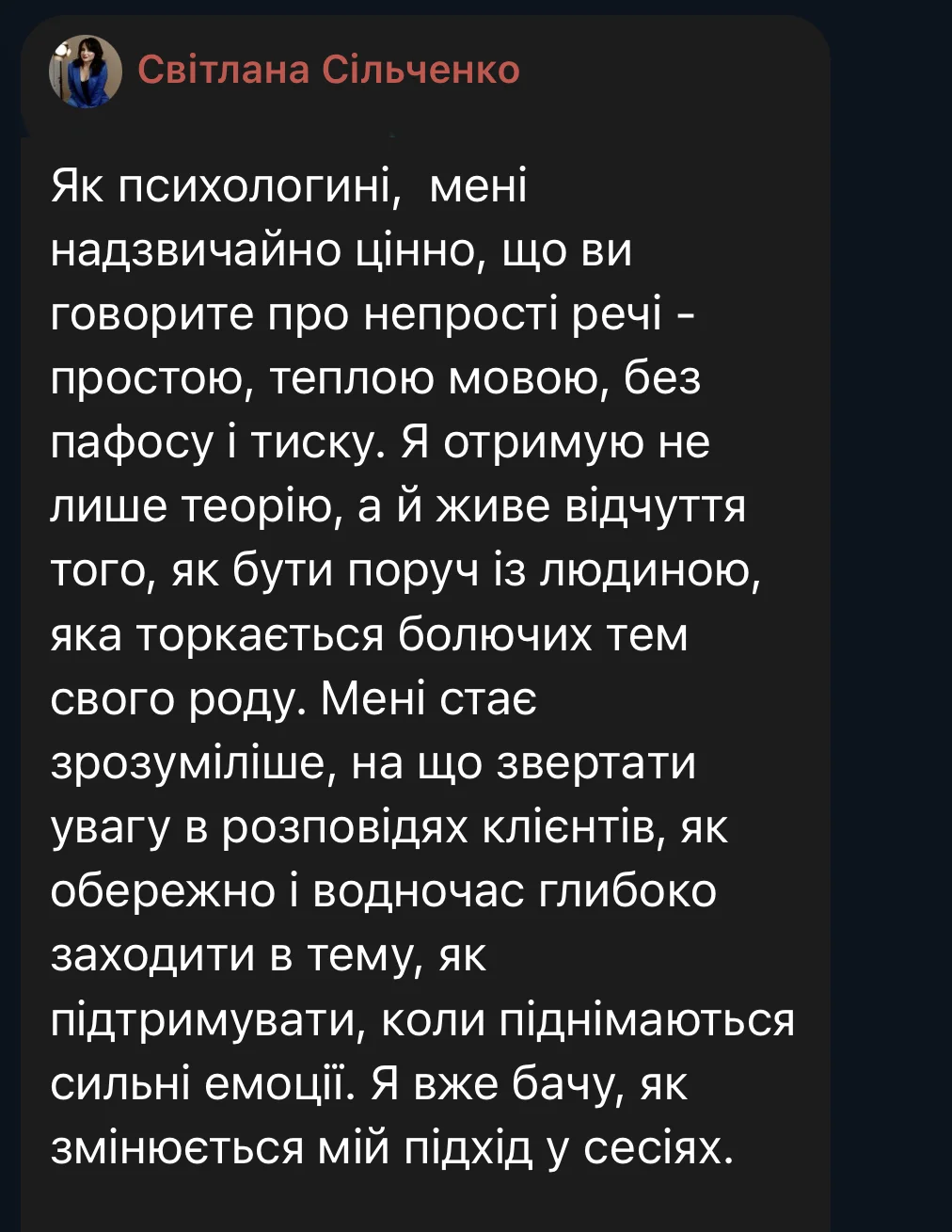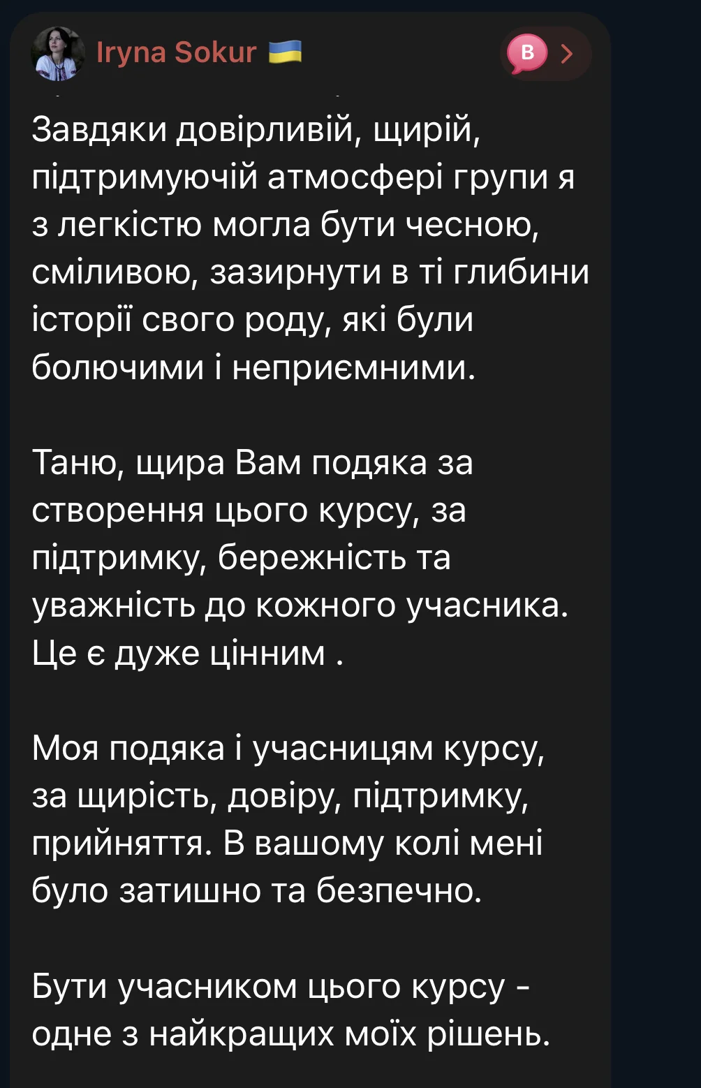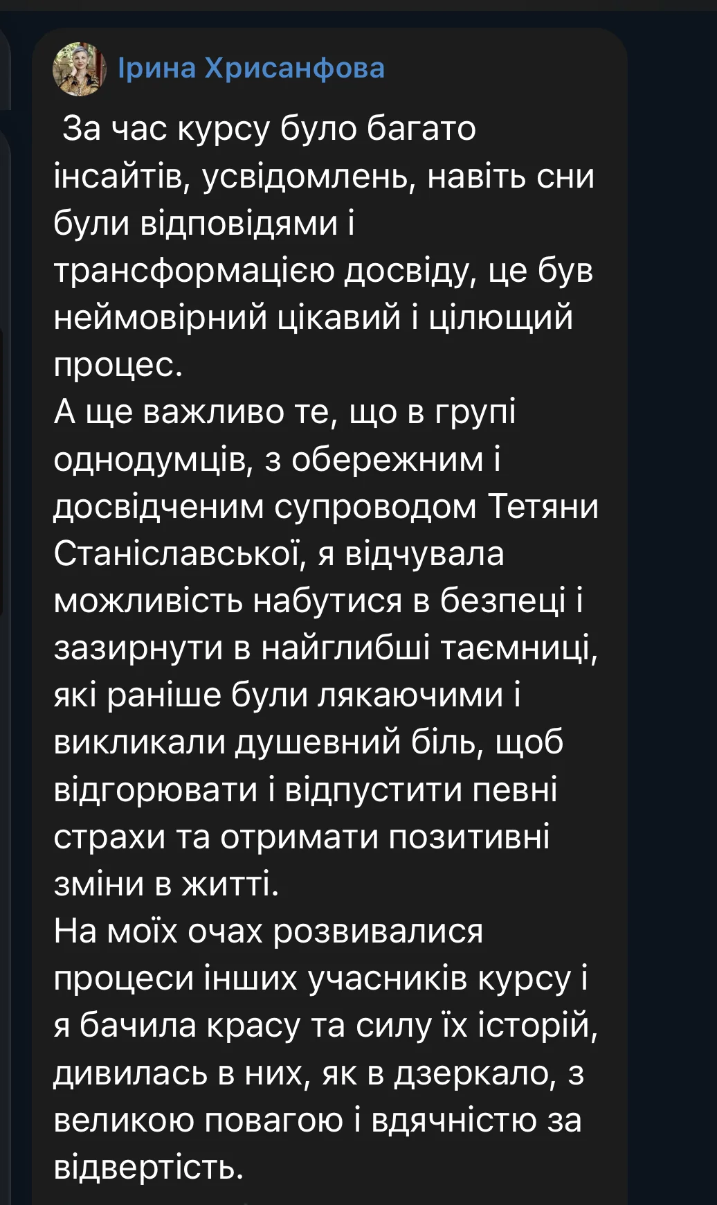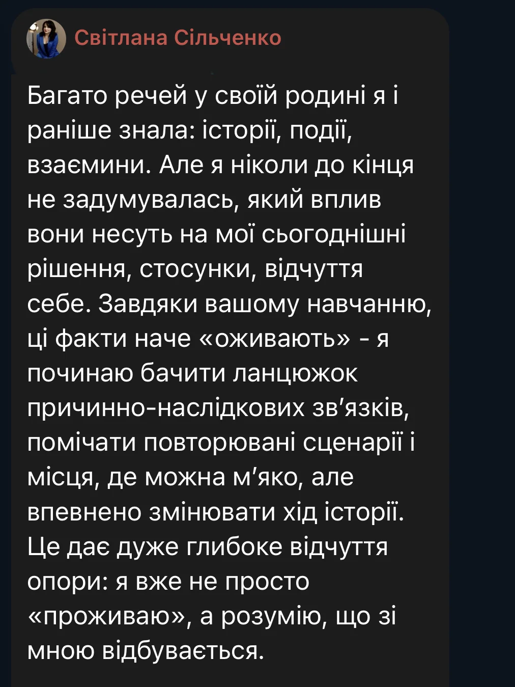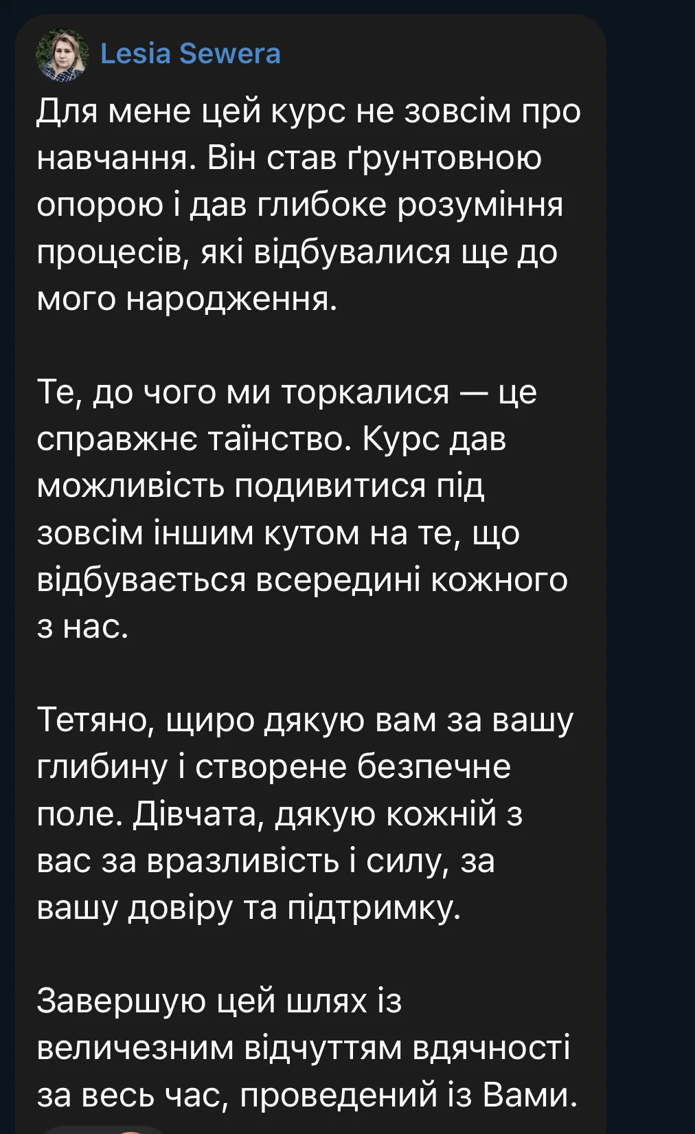 Here are some reviews from participants in the first session of the course (October 3 – December 19, 2025). The course took place amid the realities of full-scale war: rocket attacks and bombings of Ukrainian cities, total blackouts, and cuts to heat, water, and communications. Despite this, we were able to complete the entire course from the first to the last meeting, without any cancellations or postponements.