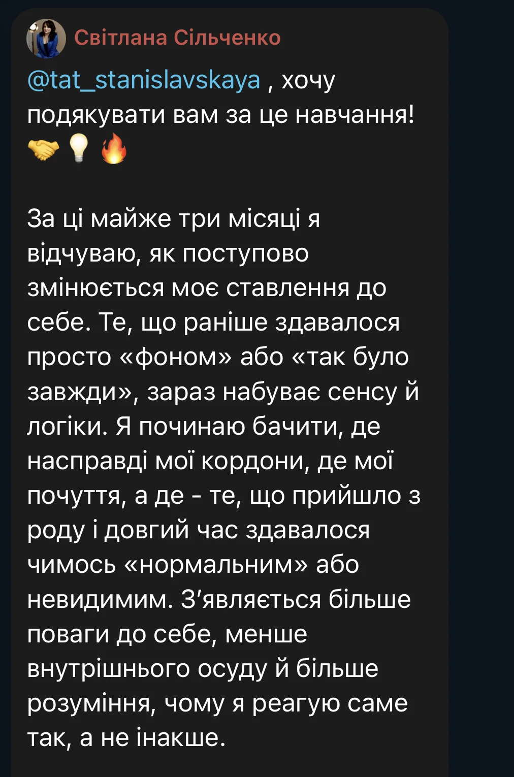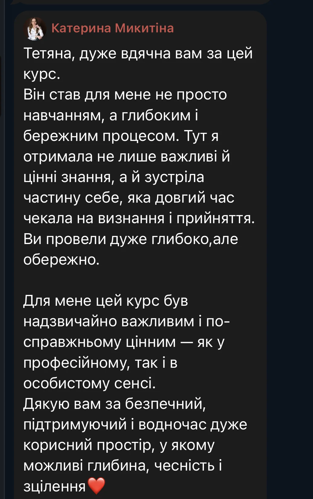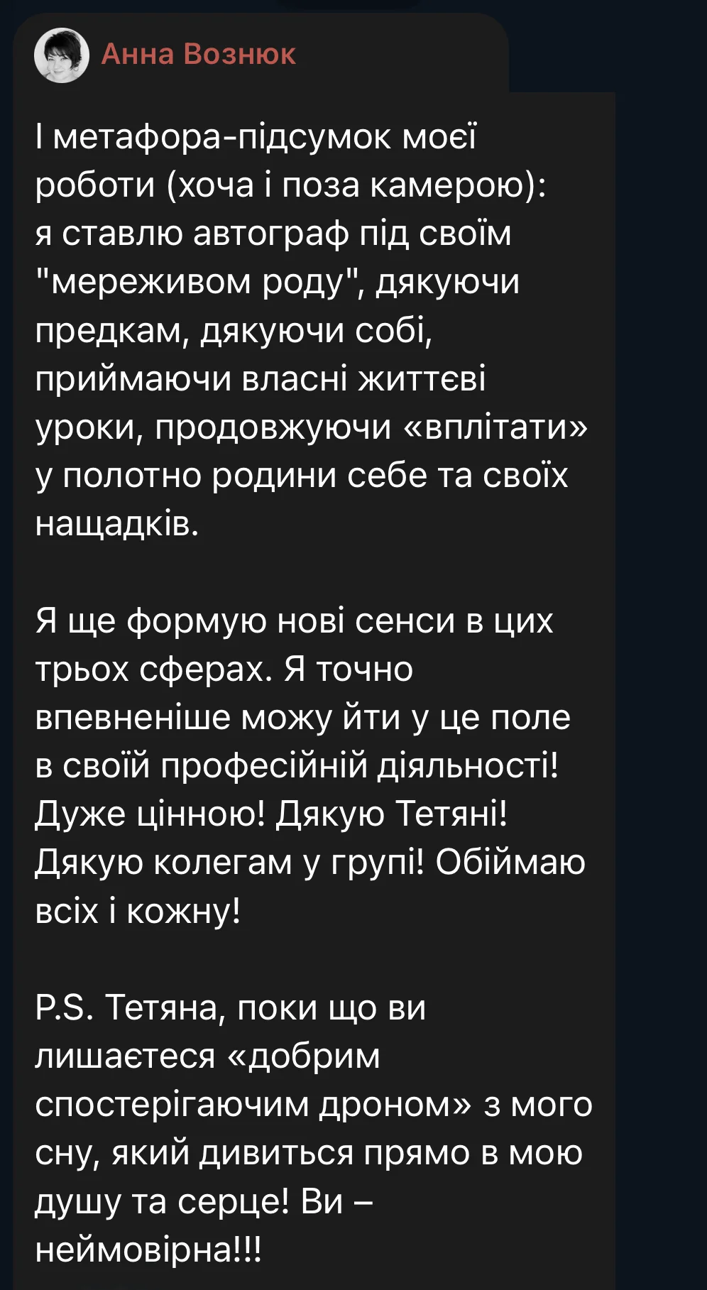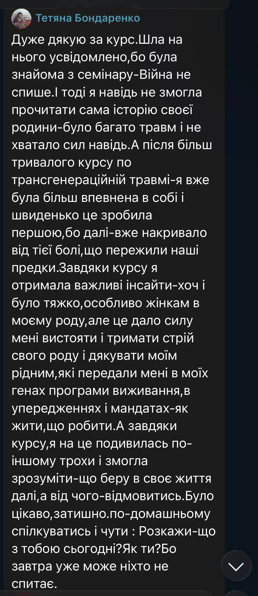 Here are some reviews from participants in the first session of the course (October 3 – December 19, 2025). The course took place amid the realities of full-scale war: rocket attacks and bombings of Ukrainian cities, total blackouts, and cuts to heat, water, and communications. Despite this, we were able to complete the entire course from the first to the last meeting, without any cancellations or postponements.