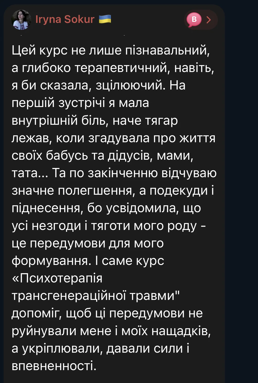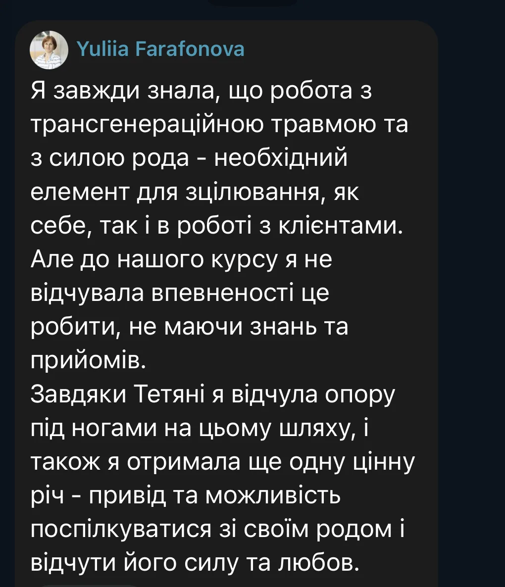From February 6 to April 24, 2026, the second stream of the course “Psychotherapy of Transgenerational Trauma” will take place. Feedback from its participants will be added later.