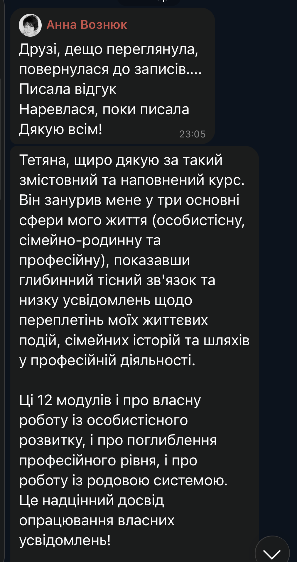 З 6 лютого до 24 квітня 2026 року триває другий потік курсу «Психотерапія трансгенераційної травми». Відгуки його учасників будуть додані пізніше.