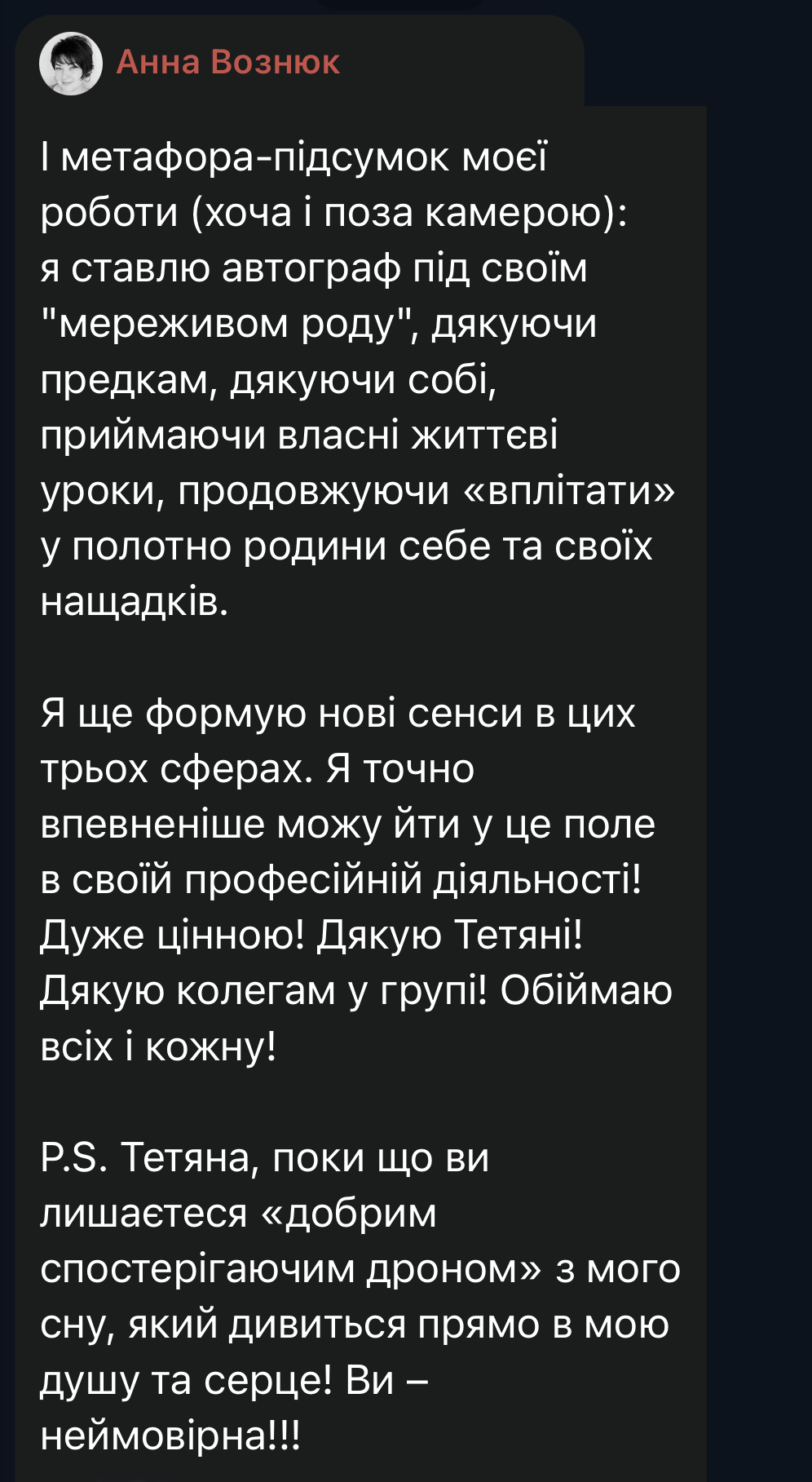 про (не)випадкові співпадіння, про те, як через сновидіння підіймається несвідоме, про зрушення в родинних системах, які відчувають терапевтичні інтервенції, про сильні жіночі гілки в родинах учасників, про те, як нічого нікуди не зникає, про найсильніші травми від матері, про генограму – як автопортрет того, хто її складає, про метафори родинних втрат, про роботу з емоційними метафорами, про синхронізацію учасників курсу між собою, про те, як працюють життєві таємниці, про наративи, про важливість свідчень твоєї історії, бо хтось має це почути, побачити, розділити, про те, як передається трансгенераційна травма (відеометафора з сірниками), про перемогу світла